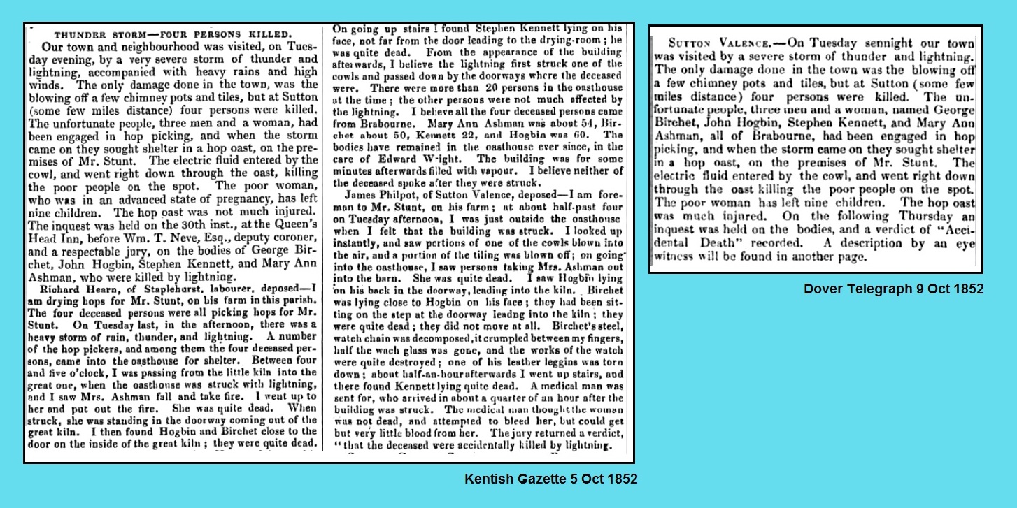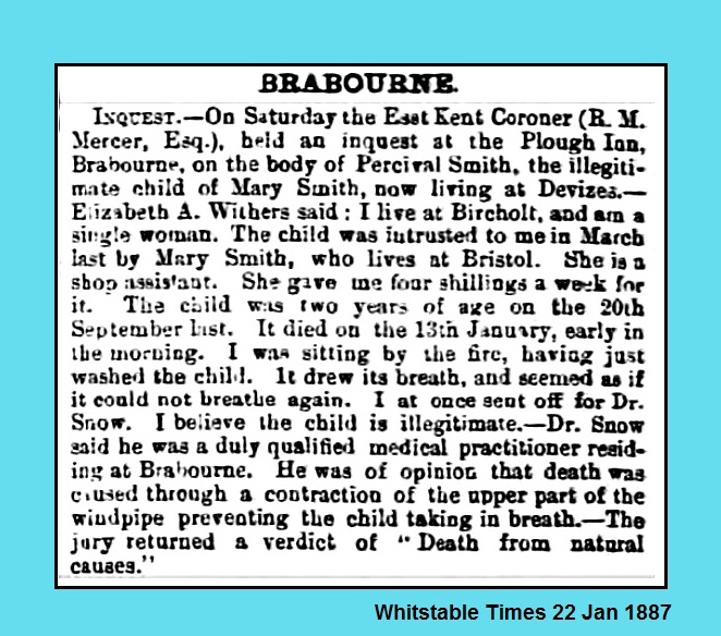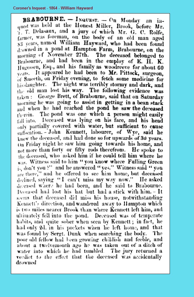Year FORENAME SURNAME AGE PARISH NOTES 04-Jan 1851 Susannah Marsh Lewis 25 Ash . 10-Jan 1851 Jemima Andrews 58 Brabourne . 17-Jan 1851 Amos Hayton 77 Brabourne Formerly Vicar of this Parish and Rector of Monks Horton 21-Jan 1851 Fanny Dodd 4 Brabourne . 08-Mar 1851 John Rogers 89 Sellinge . 13-Apr 1851 Ann Clapson 87 Brabourne . 20-Jun 1851 Mary Hills 52 Brabourne . 29-Jun 1851 Caroline Leeds 11 weeks Brabourne . 28-Oct 1851 Margaret Cook 34 Sellinge . 13-Dec 1851 William Hayward 41 Brabourne . 14-Feb 1851 Mary Leeds 22 Brabourne . 06-Jan 1852 Emma Matilda Terry 9 months Brabourne . 18-Jan 1852 Frederick Finn 14 days Brabourne . 25-Jan 1852 James Godfrey Morley 3 Brabourne . 04-Feb 1852 Sarah Ann Stoakes 3 Brabourne . 04-Feb 1852 Harry Stoakes 5 Brabourne . 21-Feb 1852 Maria Stoakes 11 months Brabourne . 22-Feb 1852 Thomas Sutton 10 weeks Saltwood . 02-Mar 1852 Emily Winder 2 Brabourne . 23-Mar 1852 Mark Delmar 66 East Ashford Union . 09-Apr 1852 Sarah Stoakes 55 Mersham . 11-Apr 1852 Stephen Hayward 14 Brabourne . 18-Apr 1852 Mary Nickolls 52 Brabourne . 25-Apr 1852 George Stickles 11 months Brabourne . 23-May 1852 Ellen Winder 4 months Brabourne . 13-Jun 1852 Thomas Sutton 24 Postling . 08-Aug 1852 Thomas Rogers 50 Wye . 03-Oct 1852 Mary Ann Ashman 24 Brabourne Killed in lightning strike [CLICK] 03-Oct 1852 John Hogben 64 Brabourne killed in lightening strike 03-Oct 1852 George Burchett 46 Brabourne killed in lightening strike 03-Oct 1852 Stephen Kennett 27 Brabourne killed in lightening strike 22-Oct 1852 Charlotte Savage 17 Smeeth . 13-Dec 1852 Elizabeth Wood 84 Brabourne . 08-Feb 1853 Jane Palmer 88 Brabourne . 26-Feb 1853 John Foord 68 Ashford . 28-Mar 1853 Albert Weekes 17 Brabourne . 03-Apr 1853 Mary Brooks 20 Sellinge . 11-Apr 1853 Sarah Elizabeth Nickolls 5 months Brooke . 19-Apr 1853 John Harvey 28 Brabourne . 08-Jun 1853 Adolphus Weekes 19 Brabourne . 09-Jun 1853 Thomas Hills 77 Folkestone . 09-Dec 1853 Mary Harley 82 East Ashford Union . 24-Feb 1854 Mary Purshouse 90 Brabourne Relict of the Rev. A Purshouse 24-Apr 1854 Edmund Palmer 88 East Ashford Union . 02-Sep 1854 Harriet Weekes 26 Brabourne . 03-Sep 1854 Sarah Philpott 75 Brabourne . 15-Sep 1854 Richard Pay Kennett 33 Brabourne . 05-Nov 1854 William Charles Hills 1 month Brabourne . 01-Dec 1854 John Cooper Inge 52 Brabourne . 01-Dec 1854 Frederick Albert Goodwin 4 months Brabourne . 17-Jan 1855 Sarah Jones 67 Brabourne . 09-Feb 1855 Charles Terry 7 weeks Brabourne . 18-Feb 1855 William Tucknott 67 Brabourne . 19-Mar 1855 James Palmer 67 Brabourne . 18-Apr 1855 Susannah Harvey 3 years Brabourne . 16-Jun 1855 George Finn 78 East Ashford Union . 17-Jun 1855 Amy Dodd 3 years Brabourne . 01-Jul 1855 Henry Trice 71 Brabourne . 20-Jul 1855 Henry Chapman 68 Brabourne . 23-Jul 1855 George Lilley 9 years Brabourne . 22-Sep 1855 Richard Hills 36 Barming Heath Lunatic Asylum . 04-Nov 1855 Henry Thomas Rogers 8 months Brabourne . 25-May 1856 Ann Conley 3 months Brabourne . 01-Jun 1856 Hannah Bartlett 24 Brabourne . 10-Aug 1856 James Cloke 11 days Brabourne . 10-Nov 1856 Richard William Arnold 8 days South Chelsea, Middlesex . 02-Nov 1856 Albert Stephen Lilley 4 days Brabourne . 15-Nov 1856 Edward Dines 85 Wye . 19-Nov 1856 Ann Smith 36 Brabourne . 10-Apr 1857 Sarah Trice 87 Brabourne . 12-Apr 1857 Charlotte Hopkins 36 Brabourne . 16-Jun 1857 Blanche Emily Rogers 8 months Brabourne . 21-Jun 1857 Elizabeth Evans 23 Brabourne . 30-Aug 1857 William Brooks 54 Sellinge . 24-Sep 1857 Harriette Foord 63 Bircholt . 21-Nov 1857 Mark Tyrell 58 East Ashford Union . 12-Dec 1857 Alfred Hills 2 years Brabourne Coroners Inquest [click] 21-Dec 1857 Margaret Hennesy 87 East Ashford Union . 30-Jan 1858 Charles Brooks 60 Crundale . 31-Jan 1858 Charles Ward 35 Bircholt . 05-Feb 1858 Elizabeth Stokes 12 Brabourne . 12-May 1858 Mary Chaplin 63 Dover . 14-May 1858 Ann Maria Stokes 33 Willesborough . 23-Nov 1858 Charlotte Young 84 Brabourne . 29-Jan 1859 Frances Mate 84 Ashford . 15-Feb 1859 Mary Hills 74 Brabourne . 29-May 1859 Charlotte Foreman 38 Brabourne . 08-Jun 1859 Henry Hopper 54 Brabourne . 22-Jun 1859 John Rogers 64 Brabourne . 18-Jul 1859 Susannah Conley 2 years Brabourne . 21-Jul 1859 Elizabeth Sarah Hayward 34 Brabourne . 26-Sep 1859 Harry Rolfe 2 days Standford . 01-Oct 1859 Elizabeth Oliver 2 days Brabourne . 26-Oct 1859 Frederic George Palmer 8 months Brabourne . 16-Nov 1859 Thomas Tedhams 82 Brabourne . 23-Nov 1859 Frances Young 36 Brabourne . 11-Dec 1859 Henry Lilley 9 Brabourne Coroners Inquest [click] 28-Dec 1859 William Ford 84 Brabourne . 01-Jan 1860 Rebecca Trice 78 Mersham . 08-Jan 1860 James Young 88 Brabourne . 12-Jan 1860 Sarah Weekes 84 Dover . 22-Feb 1860 William Lilley 5 Brabourne . 11-Mar 1860 James Norris 4 Brabourne . 18-Mar 1860 Jessy Trice 73 Brabourne . 25-Mar 1860 George Roberts 20 Nackholt . 26-Apr 1860 Charlotte Burchett 12 Brabourne . 27-May 1860 Elizabeth Roberts 91 Brabourne . 17-Jun 1860 Elizabeth Waters 77 Brabourne . 03-Aug 1860 George Pilcher 13 months Brabourne . 06-Sep 1860 Edward Foord 31 Lenham . 04-Dec 1860 Susannah Morley 49 Brabourne . 11-Jan 1861 Ann Weekes 85 Brabourne . 09-Feb 1861 Ann Dorrell 20 Smeeth . 06-Feb 1861 Ann Frances Harvey 24 Canterbury . 01-Mar 1861 Thomas Dorrell 71 Brabourne . 07-Apr 1861 Robert Gray 41 Brabourne . 21-Apr 1861 Sarah Young 84 Brabourne . 28-Apr 1861 Robert Roberts [59] Brabourne [no age recorded, but age from census a month prior to death.] 09-Jun 1861 William Burchett 22 Brabourne . 03-Jul 1861 Thomas John Sutton 15 months Brabourne . 07-Jul 1861 Rosa Smith 15 Brabourne . 16-Jul 1861 James Pilcher 61 Brabourne . 30-Jul 1861 William Young 96 Brabourne . 22-Oct 1861 James Hayward 39 East Ashford Union . 17-Nov 1861 Elizabeth Jane Kennett 1 Wye . 30-Jan 1862 Richard Morley 61 Brabourne . 16-Feb 1862 William Bartlett 59 Brabourne . 18-Jun 1862 Harriette Kennett 48 Brabourne . 12-Jul 1862 Susannah Hills 67 Brabourne . 19-Jul 1862 Mary Ann Sutton 72 Hollingbourne . 27-Jul 18