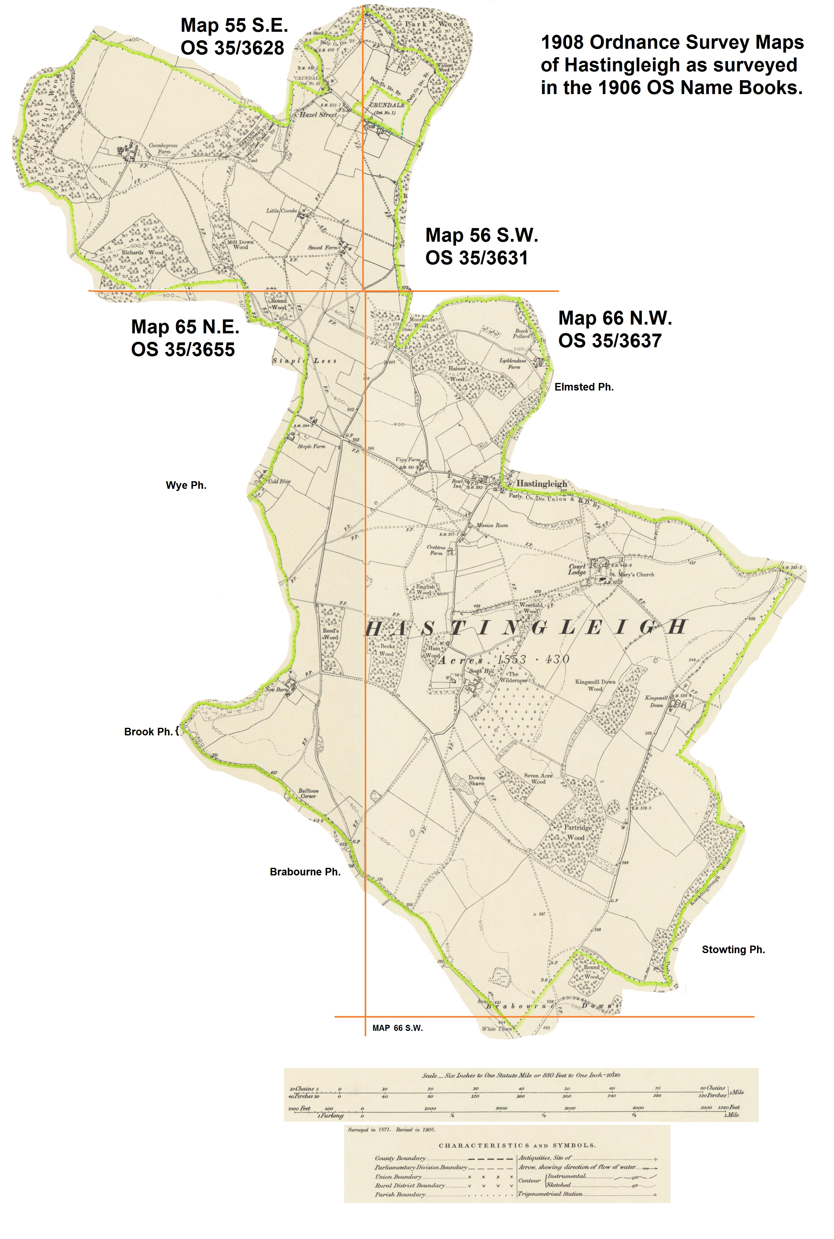 Hastingleigh on Ordnance Survey Maps surveyed in 1906The following image is taken from 5 Sheets of Kent Maps printed in 1908.