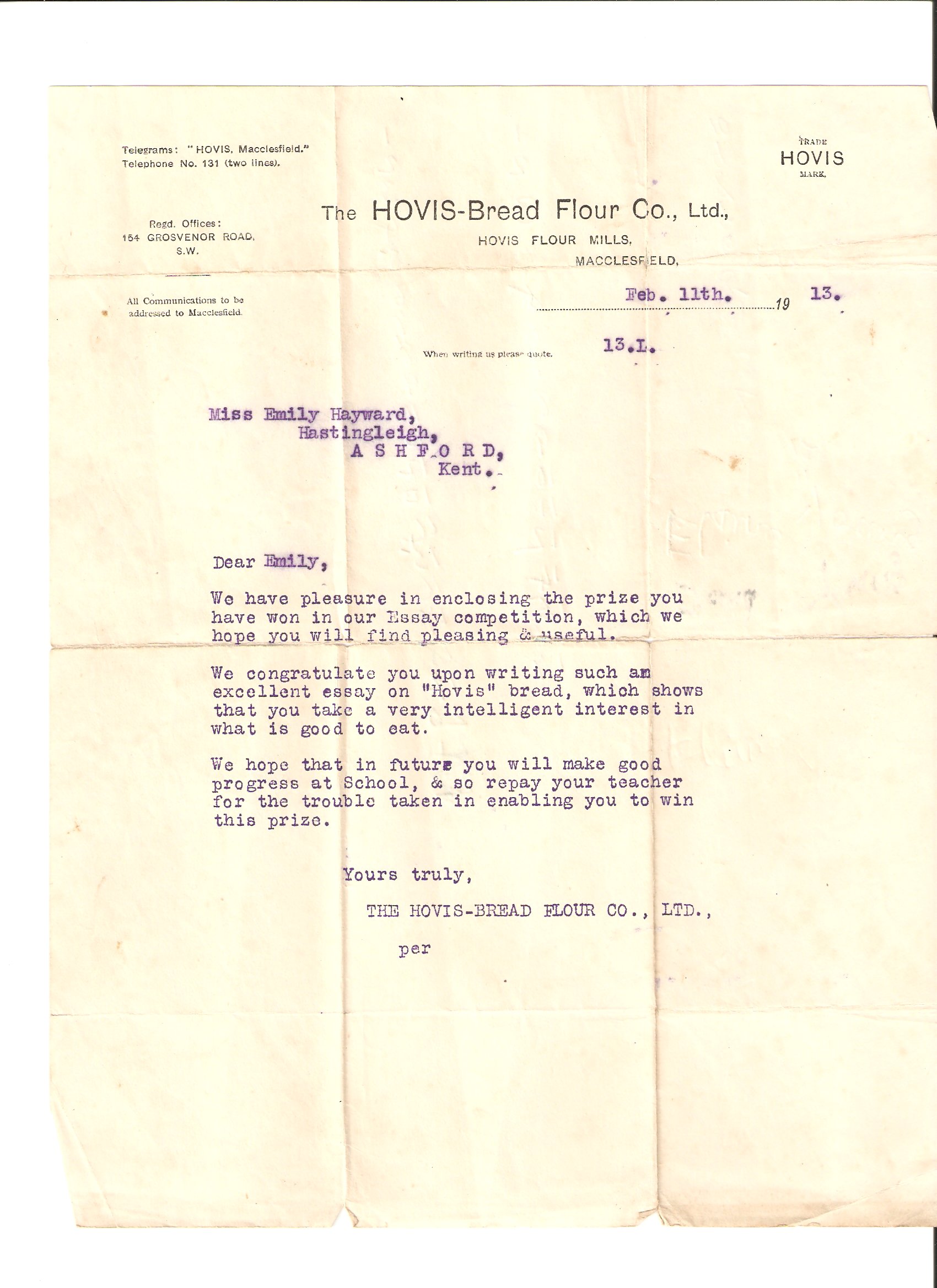 In 1912 the Hovis Bread Company in Macclesfield held an Essay competition. Mr Wetherell,